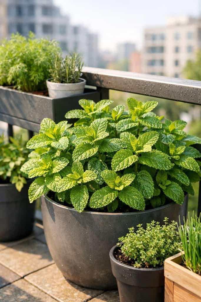 Mint grows like crazy in containers on a balcony. You can grab a few leaves for tea or muddle them into a cocktail.