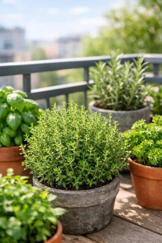 Thyme fits right into small containers on your balcony. It likes the sun and honestly doesn’t need much water.