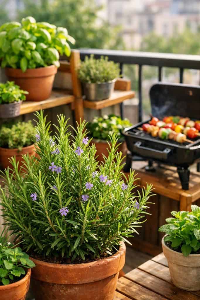 Rosemary really belongs in any balcony herb garden. The scent alone is worth it, and it does well in containers.