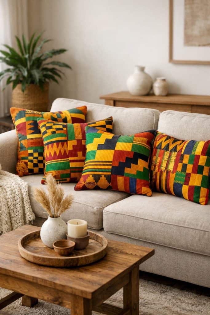 Kente cloth pillows add bold color and meaning to plain sofas. Mix up different kente patterns for a playful, eye-catching look.