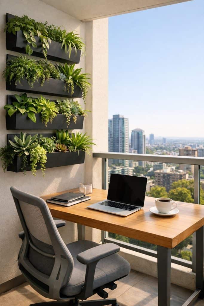Vertical wall planters let you add some plants to your balcony without crowding your desk or floor. Mount them on the walls to create a living green backdrop while you work.