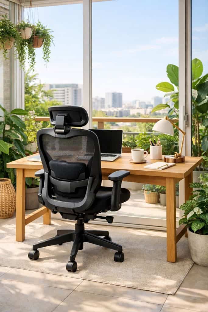 Your balcony workspace needs a chair that actually takes care of your back. An ergonomic chair with lumbar support helps you stay comfortable during those long study sessions.