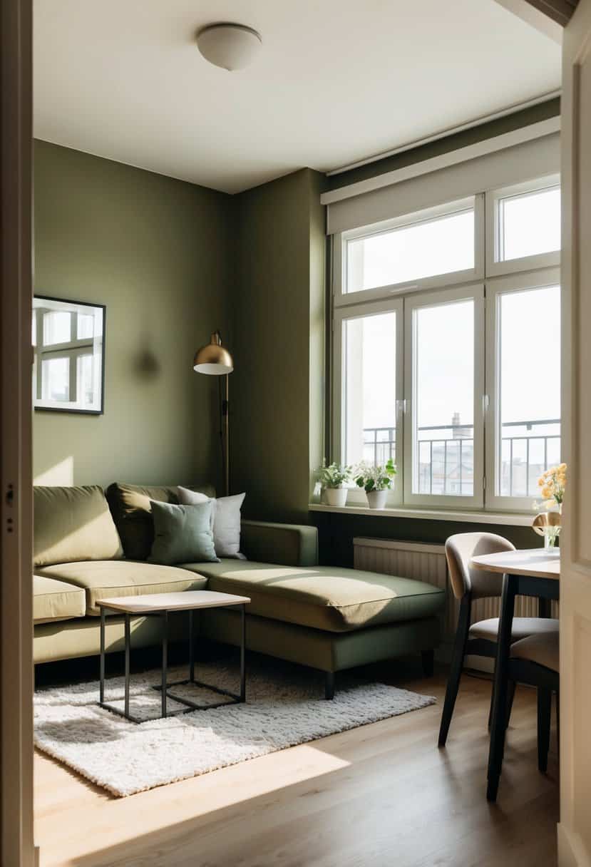 Muted olive paint can make your small apartment feel cozy and sophisticated. This earthy tone brings a touch of nature indoors, creating a calming atmosphere.