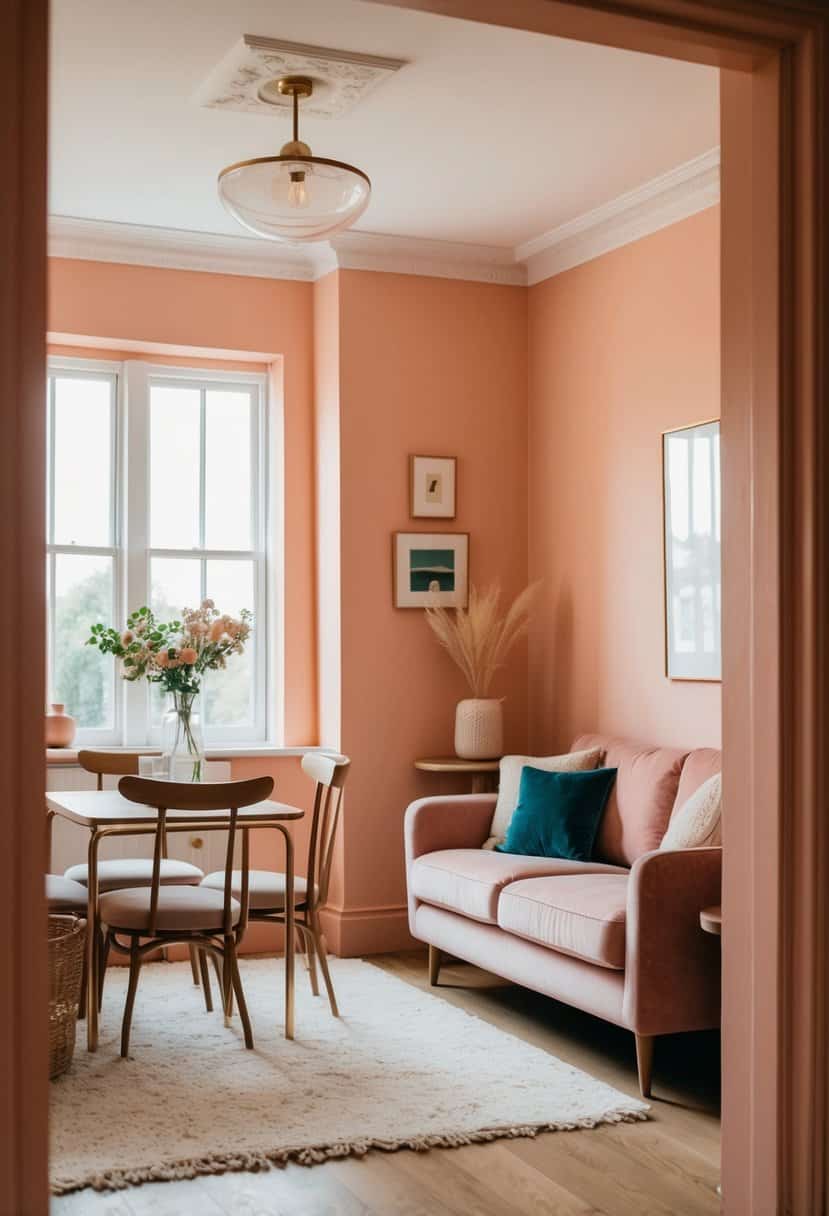 Try pairing soft peach walls with white trim for a fresh, clean look. Add some plants or natural wood accents to complement the peachy tones.