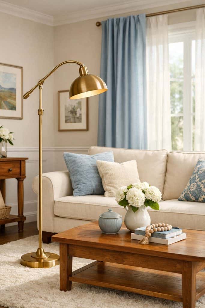 You can add a touch of warmth with a brushed-brass floor lamp in your blue-and-cream living room. The finish feels soft and blends with both colors without being flashy.