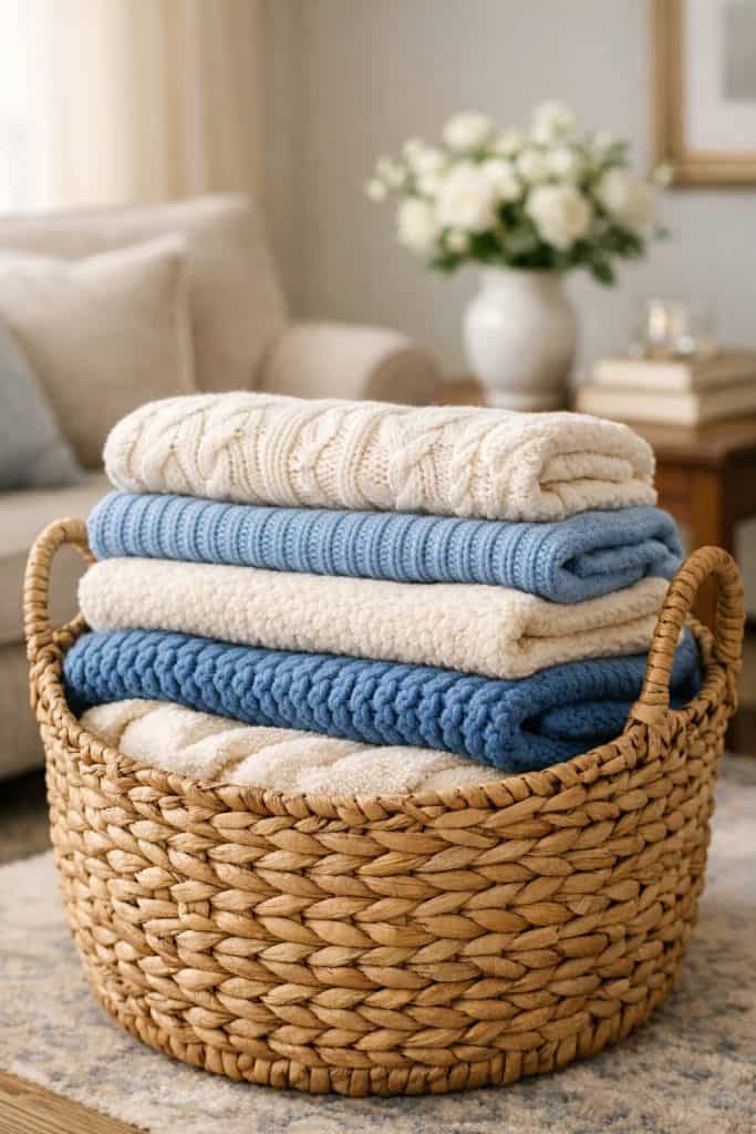 Add a woven basket filled with blue and cream blankets for a stylish look while keeping things handy. Set it by your sofa or armchair for easy access.