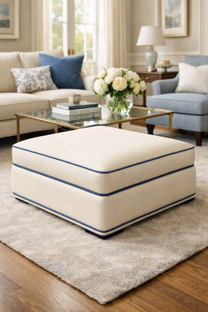 A cream ottoman brings soft seating to your living room. Blue piping around the edges ties your color scheme together.