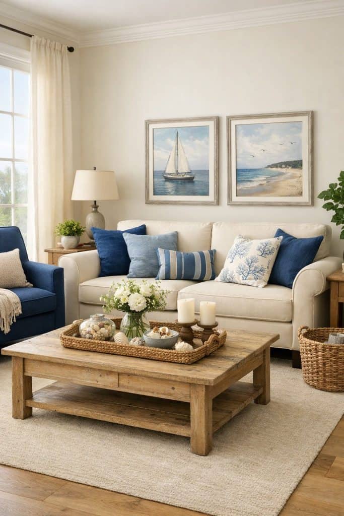 Hang ocean-themed prints or soft blue and cream paintings on your walls. Look for seascapes, sailboats, or beach scenes that fit your vibe.