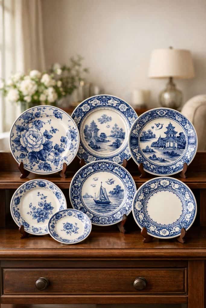 Why not turn blue and cream porcelain plates into wall art in your living room? Try hanging them above your sofa, or just arrange them on floating shelves.