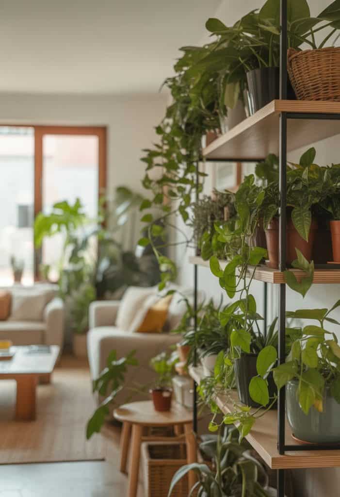 Let trailing plants like pothos or string of pearls spill off your shelves. The greenery creates a relaxed, natural look and softens the whole room.