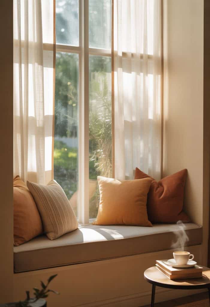 Turn your window space into a little retreat with soft cushions and throws. Add a wooden bench and stack it with comfy pillows in warm colors.