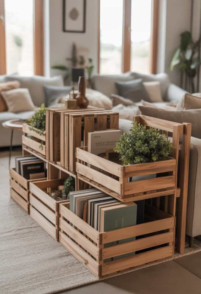 Stack wooden crates to bring in cafe charm and keep clutter away. Use them as open shelves for books and plants.