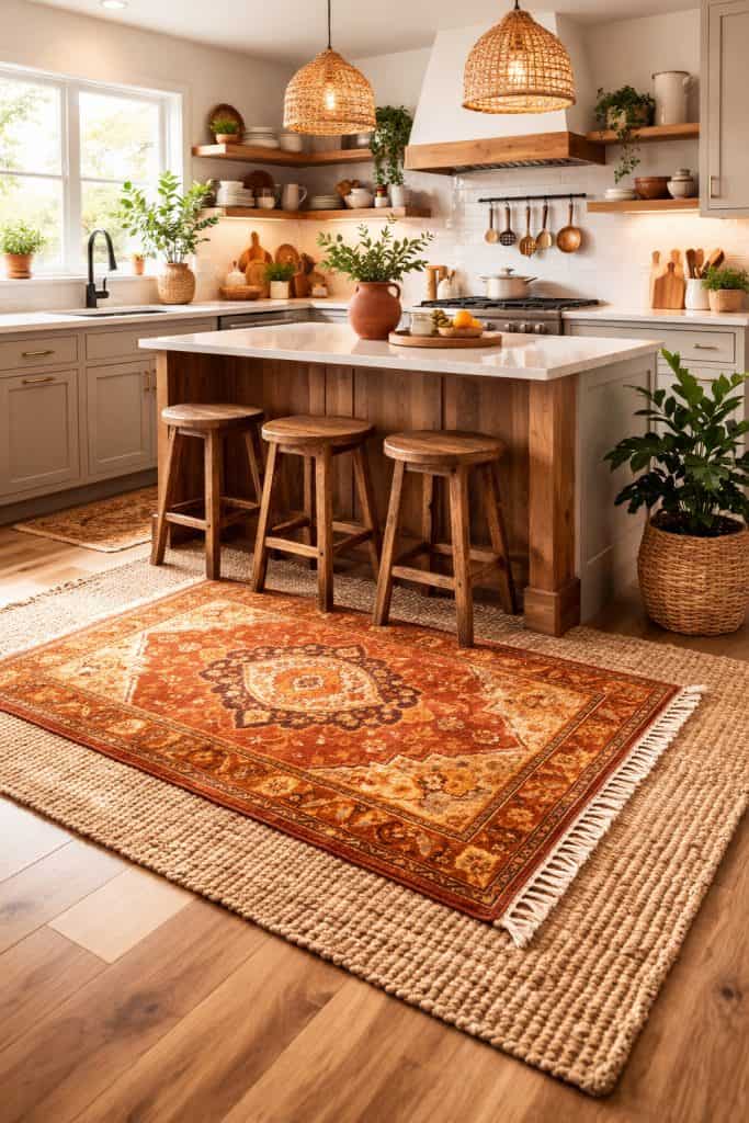 Layering two rugs instantly adds warmth and interest. Start with a neutral jute or woven rug as your base.