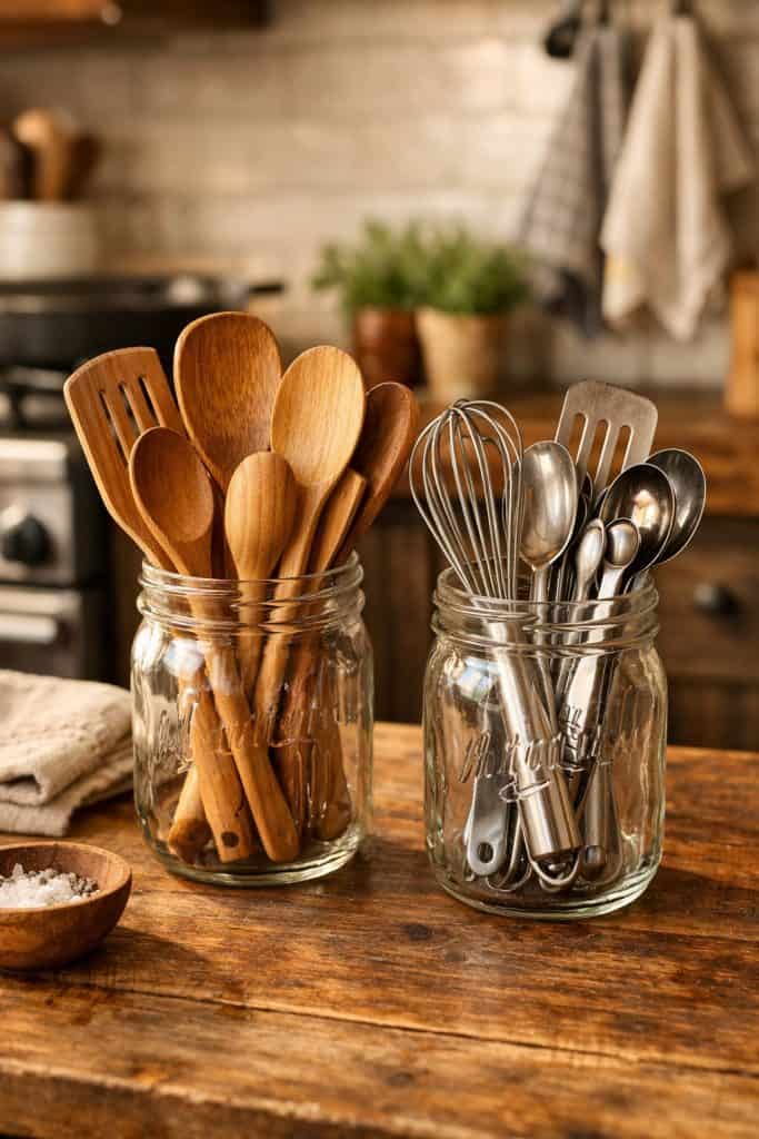 Mason jars work perfectly as utensil holders. Use them plain or paint them to match your kitchen’s vibe.