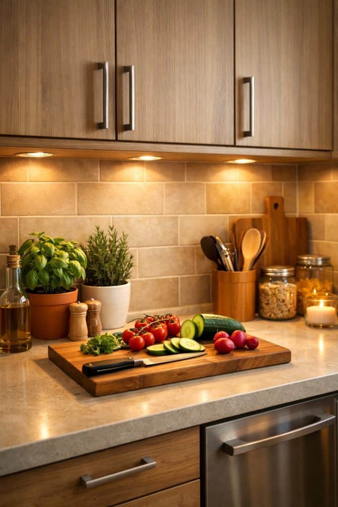 Try warm-toned LED strips or puck lights. They’re easy to install and make a big difference.