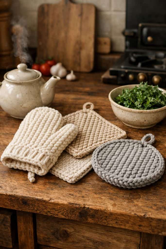 Knitted oven mitts and pot holders bring a cozy, handmade touch to your kitchen. Honestly, they just make the space feel warmer and a bit more lived-in.