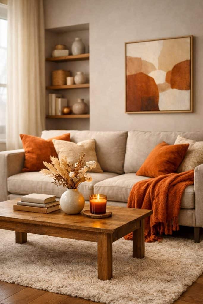Start with a neutral base for a peaceful vibe. Then add burnt orange accents—maybe some throw pillows or a bold piece of art.