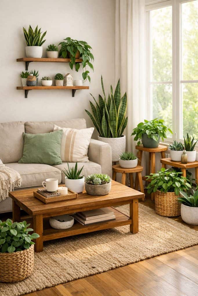 Plants bring fresh energy to any living room. Go for low-maintenance options like snake plants or air plants if you don’t want too much fuss.