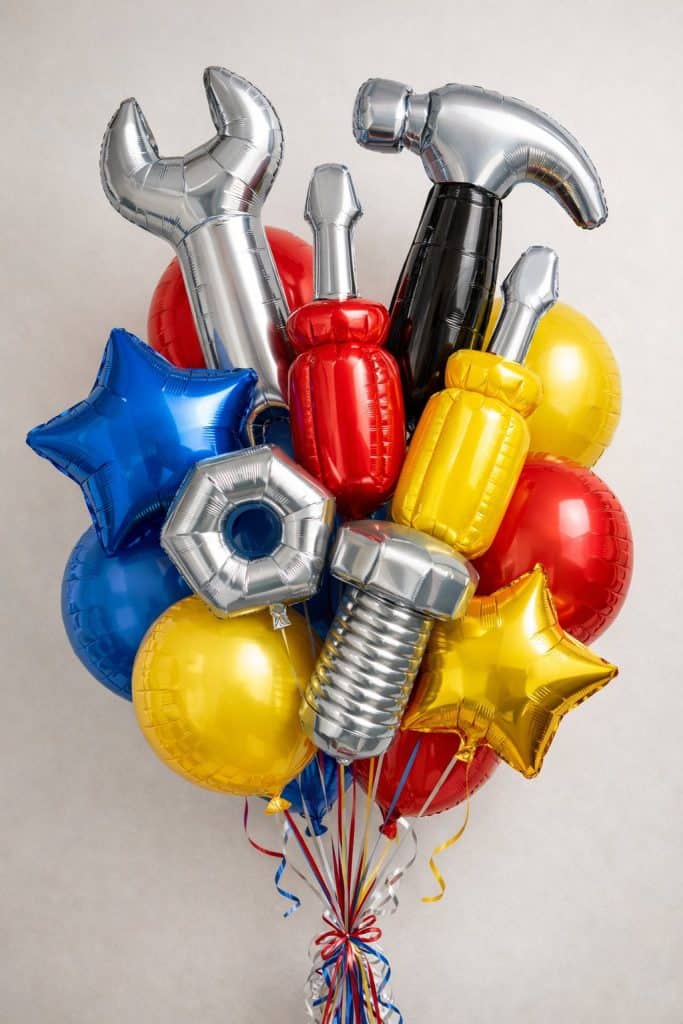 Pick up some tool-shaped foil balloons—think hammers, wrenches, drills. Party stores usually carry them, or you can find them online.