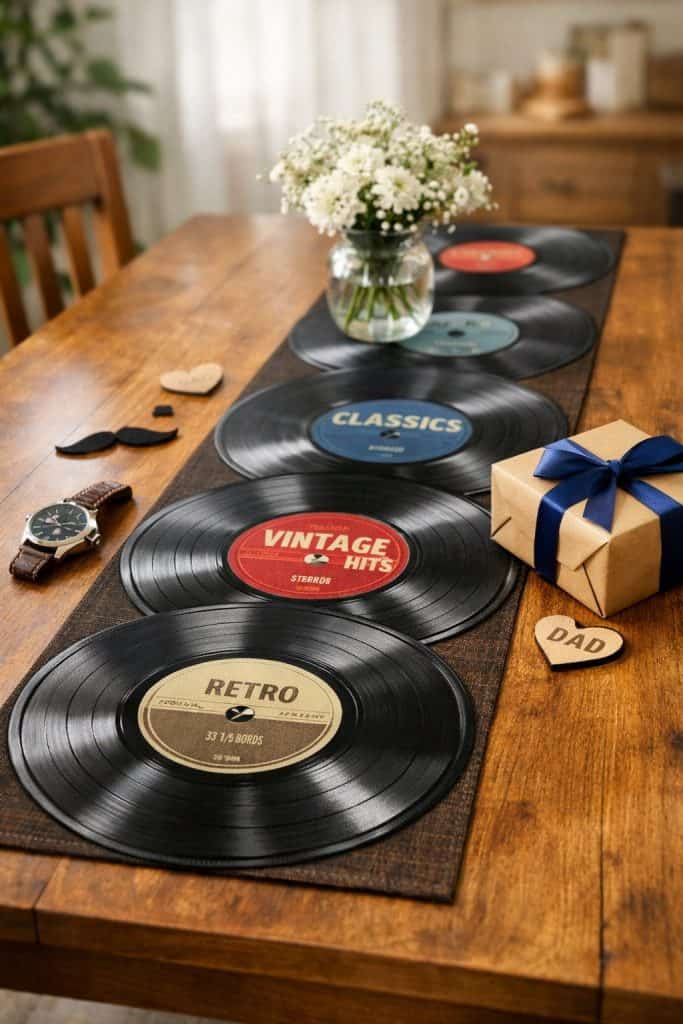 Line up vinyl records printed retro runner down the center of your table. If your dad’s into music, this will totally catch his eye.