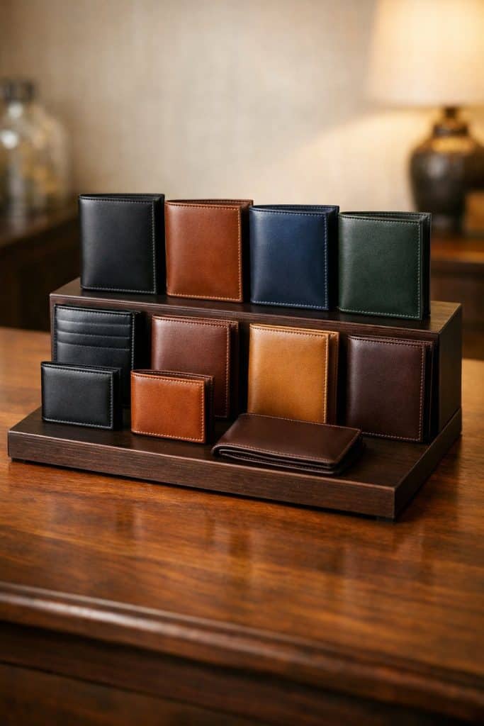 Set up a display stand for a new leather wallet gift. Place the wallet on a small block or stand and add a handwritten note.