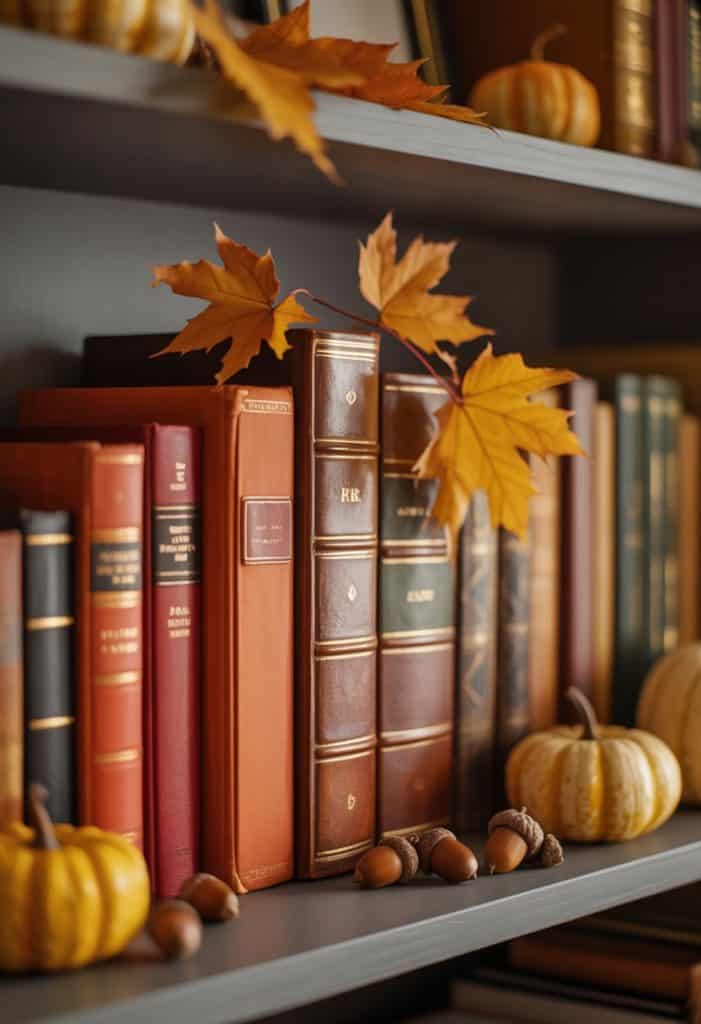 17. Place cozy leather-bound books with autumn-themed covers on shelves
