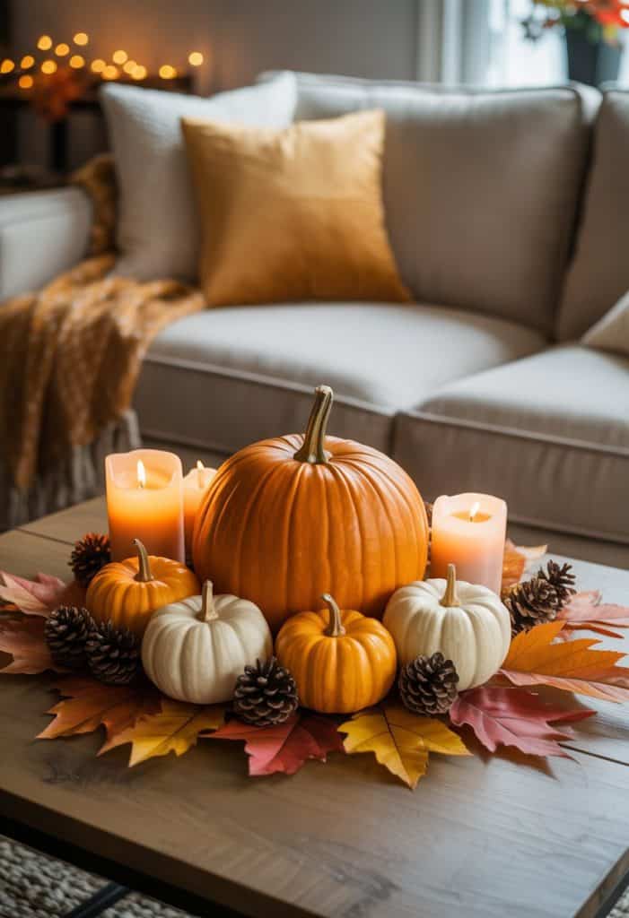 Cluster different sizes together on your coffee table. The white pumpkins feel elegant, and the orange ones add a pop of warmth.