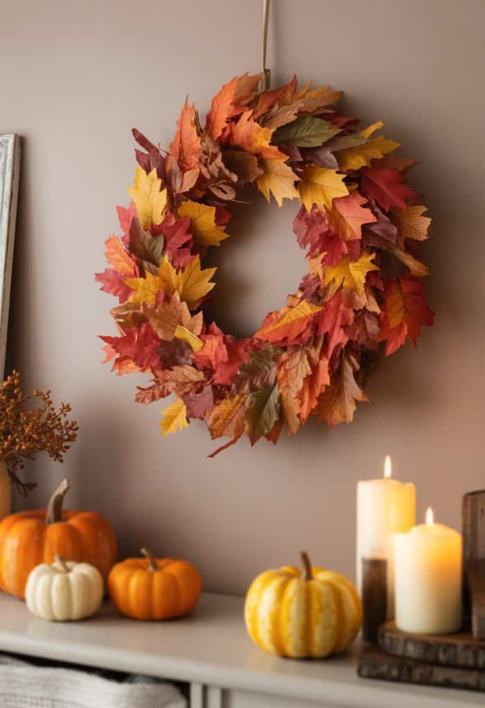 Make a wreath with colorful fall leaves—real or faux, whatever works. Attach them to a wire or grapevine base with hot glue.