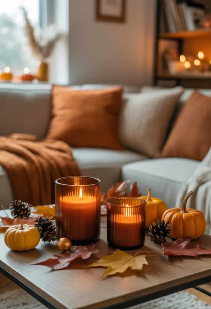 Amber glass candle holders cast a warm, golden glow. They fit the fall mood perfectly.