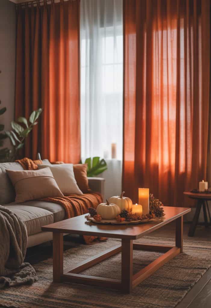 Light curtains can make a room feel chilly once fall hits. Swap them for burnt orange or rust-colored curtains.