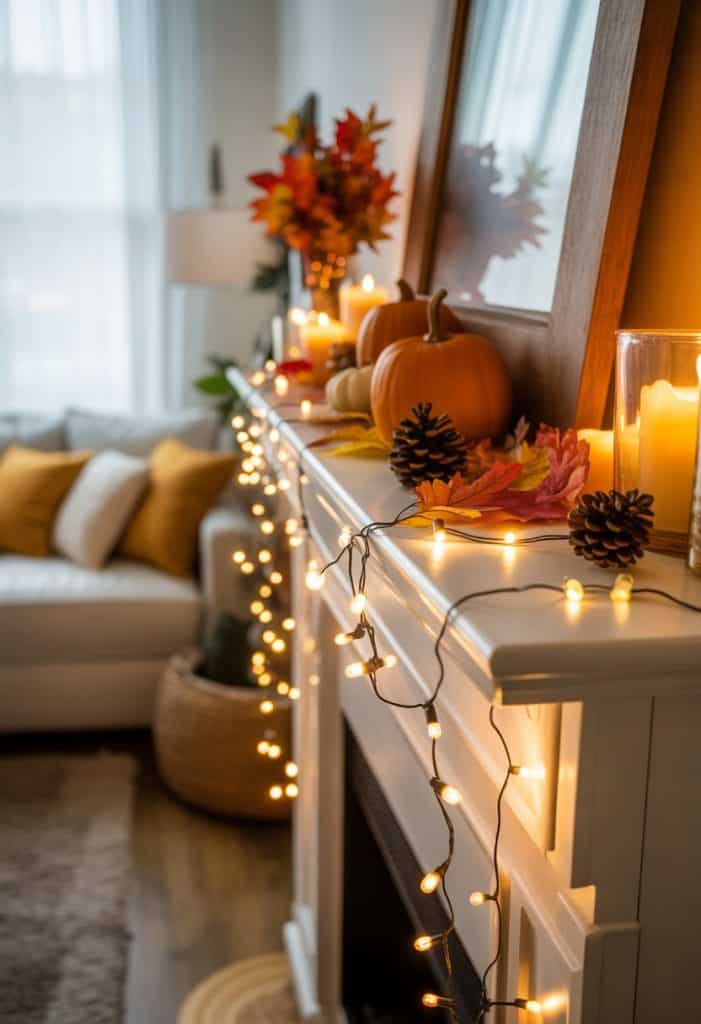 String lights make your mantel feel extra cozy. Warm white LEDs work best for that autumn glow.
