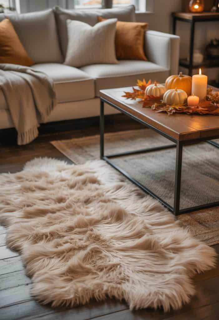 A faux fur rug adds warmth and softness right where you need it. Place one under your coffee table or in front of the sofa.