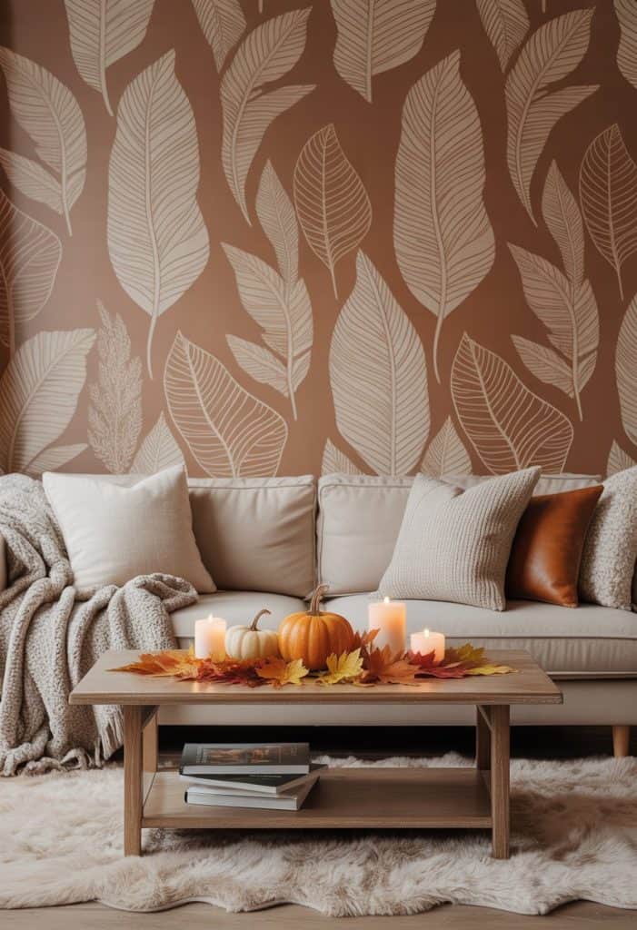 Peel-and-stick wallpaper is a game changer for seasonal updates. Pick a design with soft leaf patterns in cozy colors.
