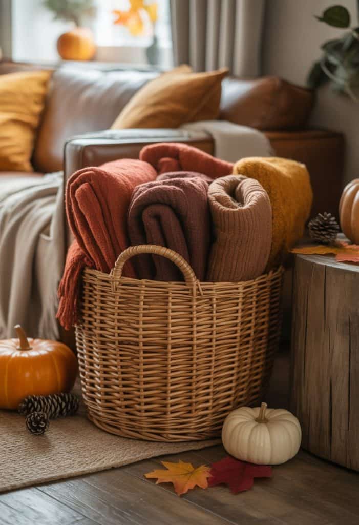18. Use a woven basket to hold extra fall-colored throw blankets