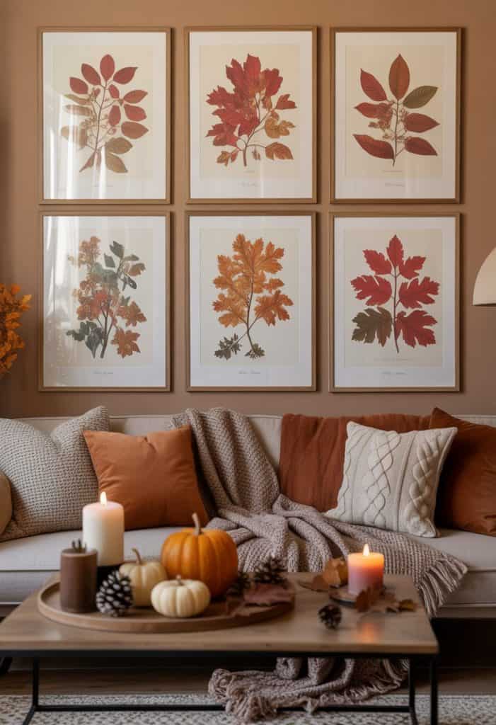 Hang up framed prints of fall leaves, acorns, or autumn plants. Botanical art instantly brings the season indoors.