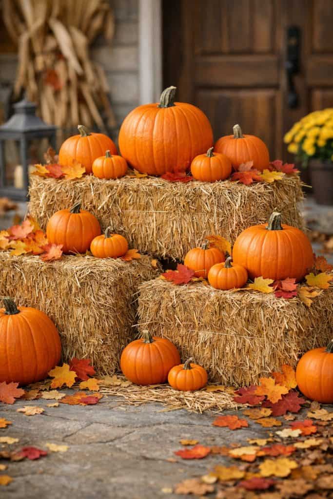 7. Stacked Hay Bales with Pumpkin Display