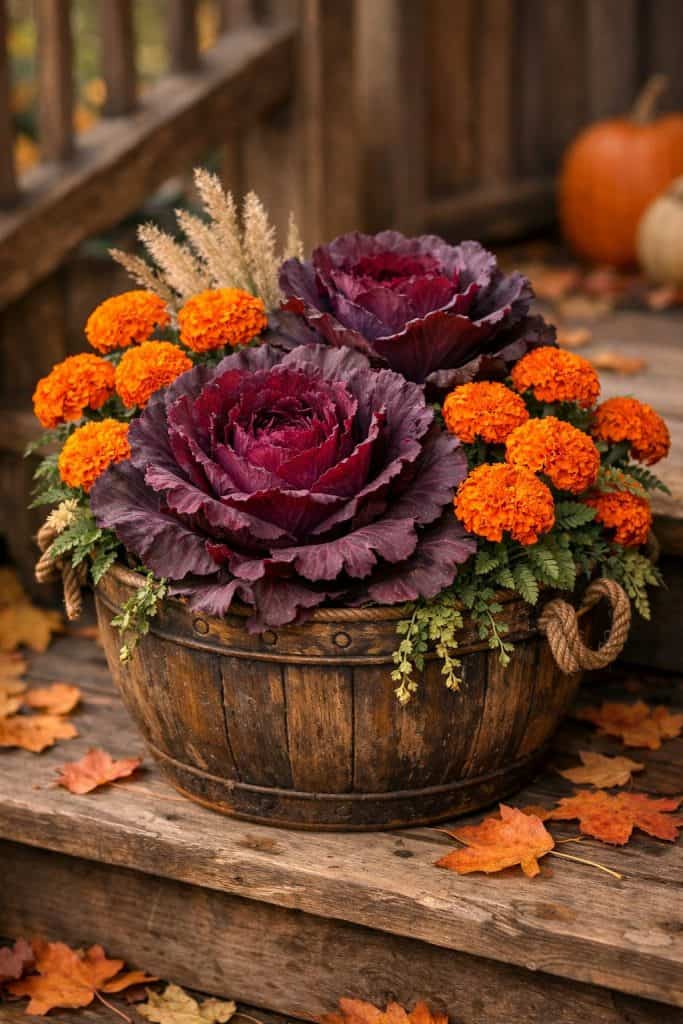 This color combo is a showstopper for fall. The deep purple-red of ornamental cabbage sits perfectly with bright orange marigolds.