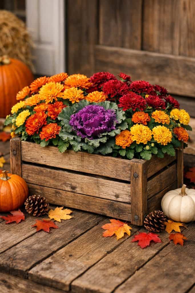 10. Wooden Crate Planter with Mixed Fall Flowers