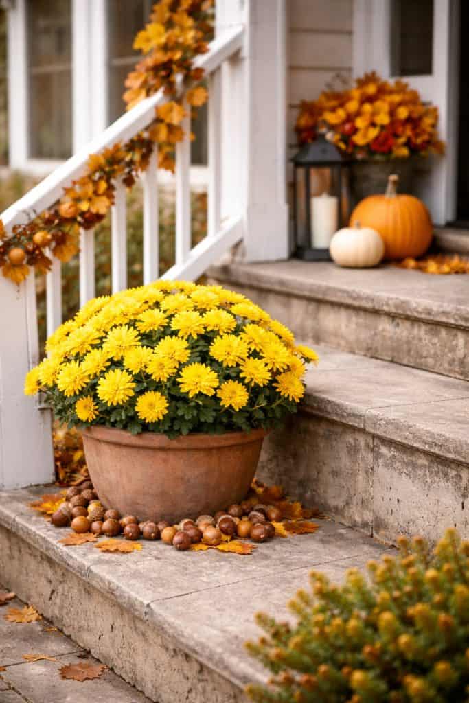Yellow mums add a sunny pop to your porch. Sprinkle natural acorns around the planter’s base for a little woodland touch.