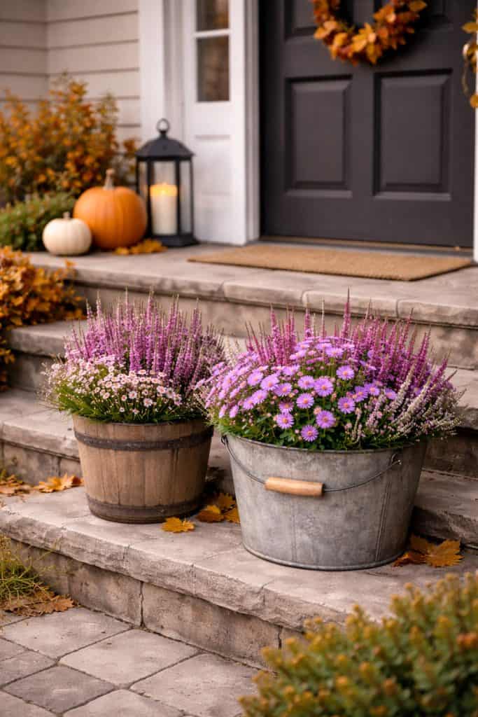 15. Mix of Heather and Asters in Rustic Pots