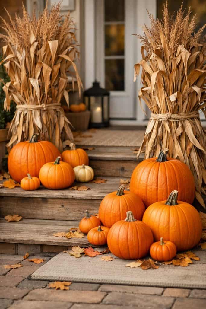 Set tall cornstalk bundles on each side of your front door. Add some bright orange pumpkins at the base.