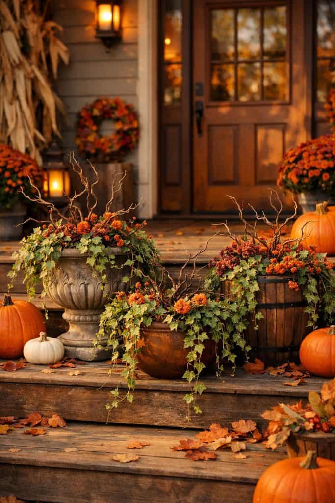 Here’s a fun idea: use faux mums instead of real ones. They stay vibrant without watering and let you create a long-lasting, low-maintenance fall display.