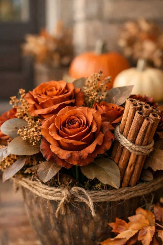 Finish the look by bundling cinnamon sticks with twine and tucking them between the roses. They add a rustic touch and a cozy scent every time you walk by.