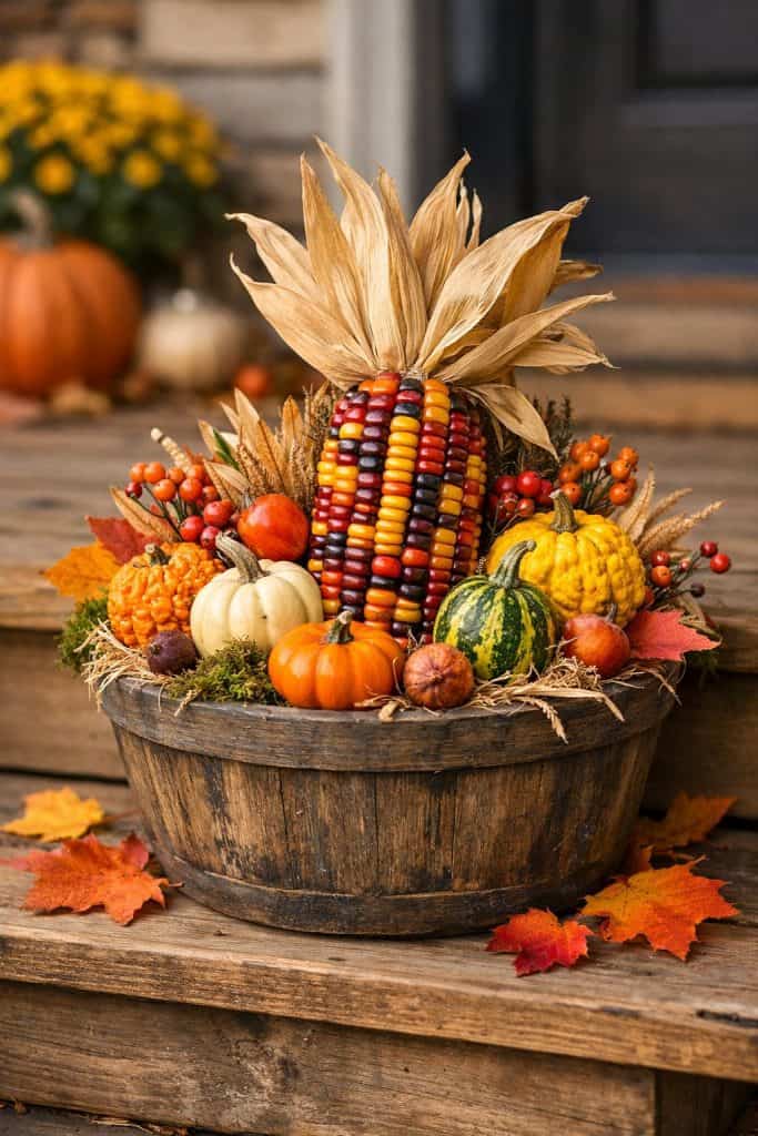 Pile up different sizes of pumpkins with colorful gourds in a big container. This combo brings fall charm right to your doorstep.