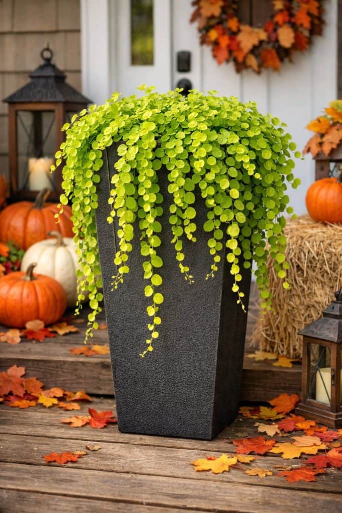 Creeping Jenny adds a bright chartreuse color that drapes over the planter’s edge. This trailing plant softens tall containers and brings a bit of movement.