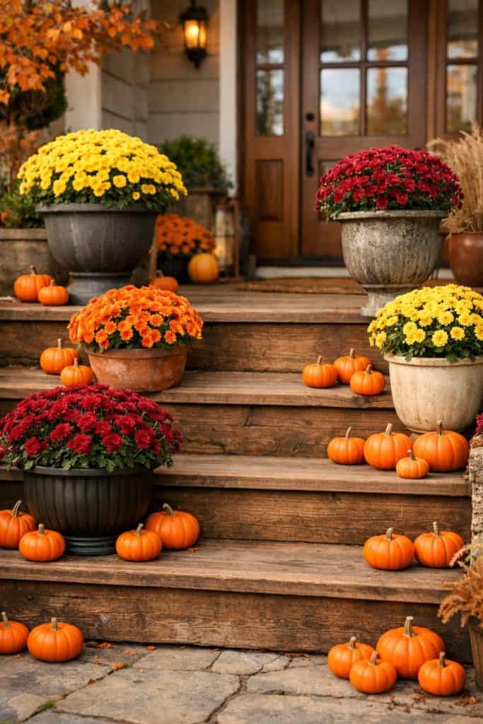 Here’s a fun idea: use faux mums instead of real ones. They stay vibrant without watering and let you create a long-lasting, low-maintenance fall display.