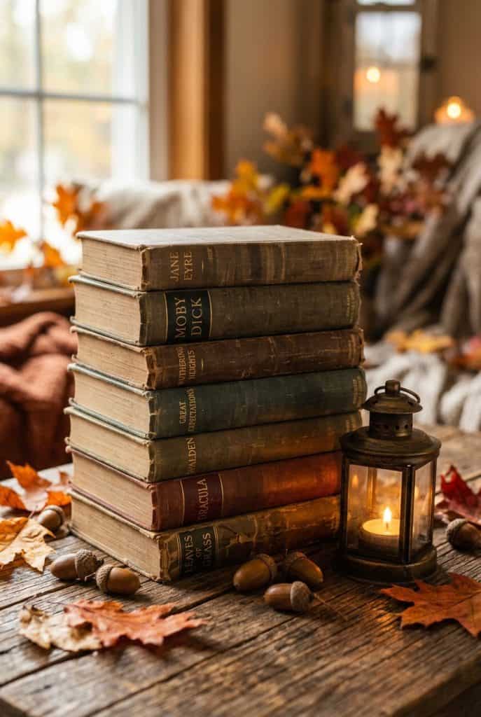 Stack up a few old books, set a little lantern on top, and scatter some acorns around. It’s a simple bookshelf idea that feels a bit collected and seasonal.