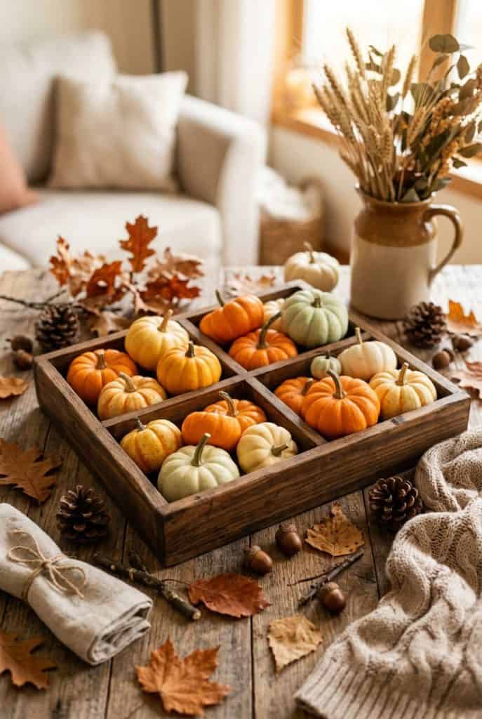 Use a divided wooden box tray and fill each spot with different small pumpkins or gourds. The compartments keep things neat and add a little visual interest.