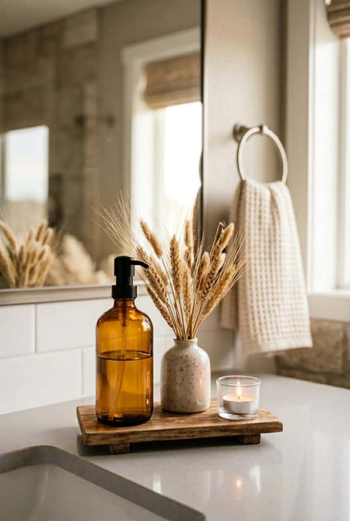 Swap your usual soap for an amber glass bottle, then add wheat stems and a tea light. Even the bathroom gets a little fall love.