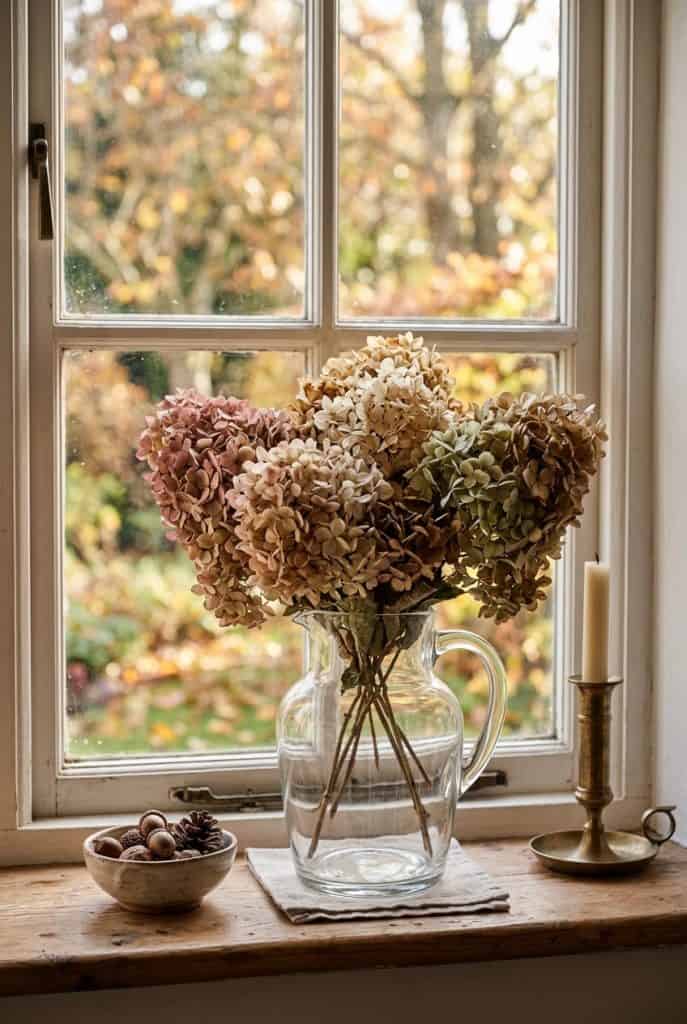 Drop dried hydrangeas into a clear glass jug and set it on your windowsill. The natural light really makes those muted fall colors shine.
